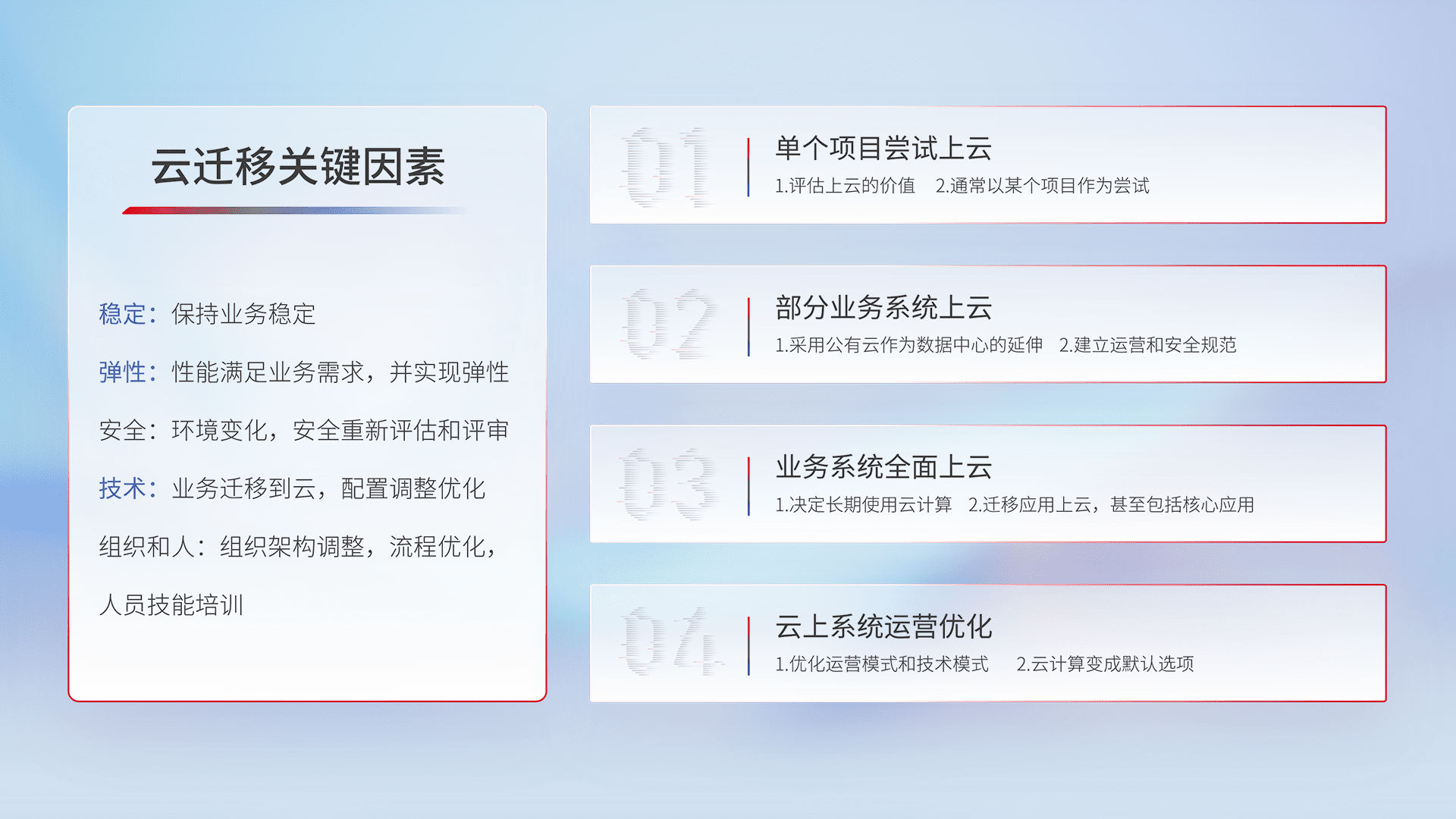 结合实际业务,,,,从规划设计、、、云平台选型、、、云原生改造、、、数据迁移、、、集成交付,,迁移全过程为客户识别最佳上云路径,,做好风险识别管理,,,,设计网络架构、、、身份权限、、、、安全审计合规、、、操作审计、、、、日志审计、、监控告警策略、、、多站点容灾设计等,,对云上基础设施进行整体规划,,,提升IT治理水平,,以满足弹性、、、、高可用、、、高性能的需求。。。。