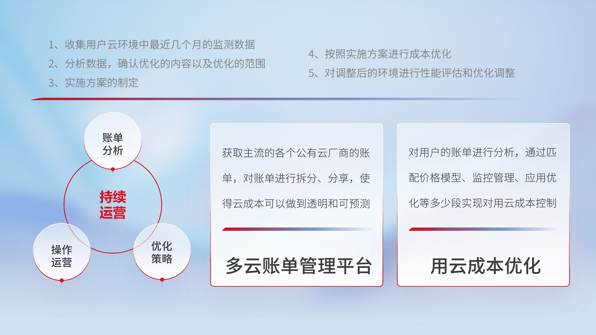 通过多云纳管,,,,以统一的资源数据模型把客户的云资源进行抽象和封装,,,,进而实现对多云资源的统一操作,,保障云资源管理的可靠性、、稳定性与可用性。。。。量身定制化运维内容,,,,配置、、开发运维、、、、补丁管理、、备份、、监控、、认证和访问管理、、、、审计和日常巡检等,,保障在用云过程中的可靠度,,,,稳定度以及高可用率。。
